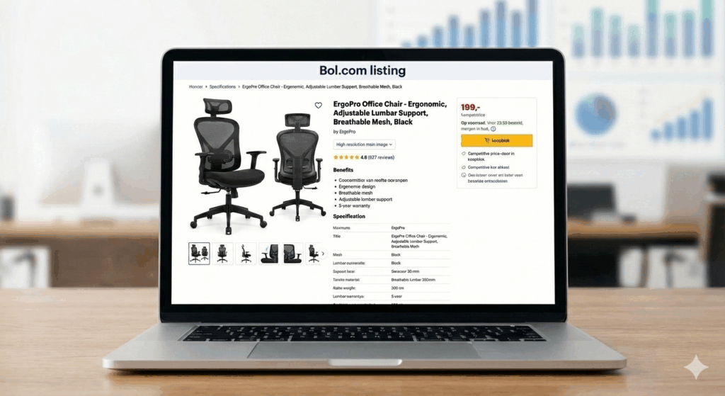Een listing die alleen ‘bestaat’, verkoopt niet. Een goede vermelding overtuigt zowel het algoritme als de consument. De titel moet de belangrijkste zoekwoorden bevatten zonder onnatuurlijk over te komen. De productkenmerken (attributen) en de bullet points moeten de meest prangende vragen van de klant beantwoorden voordat ze gesteld worden.